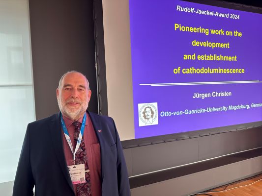 Jürgen Christen erhielt die Auszeichnung „in Würdigung seiner herausragenden Leistungen auf den von der DVG betreuten Wissenschafts- und Technologiebereichen insbesondere für seine Pionierarbeiten zur Entwicklung und Etablierung der Kathodolumineszenz“. Der Preis wurde ihm Anfang September im Rahmen der Vacuum Session auf der 19th International Conference on Plasma Surface Engineering (PSE) in Erfurt überreicht.