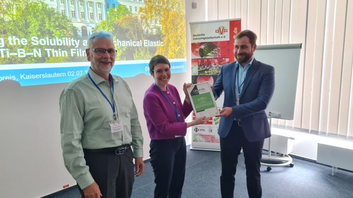 Die Deutsche Vakuum-Gesellschaft hat Yannick Kathage, Dr. Caroline Hain und Rebecca Janknecht mit dem diesjährigen Vacom-Nachhaltigkeitspreis in Gold, Silber und Bronze ausgezeichnet. Die drei Promotionsabsolventen haben in ihren Arbeiten auf besondere Weise Techniken, Methoden oder Geräte aus dem Gebiet der vakuumgestützten Technologien genutzt, um die Nachhaltigkeit von technischen Lösungen, Verfahren oder Produkten zu steigern und Kreislaufprozesse zu implementieren.