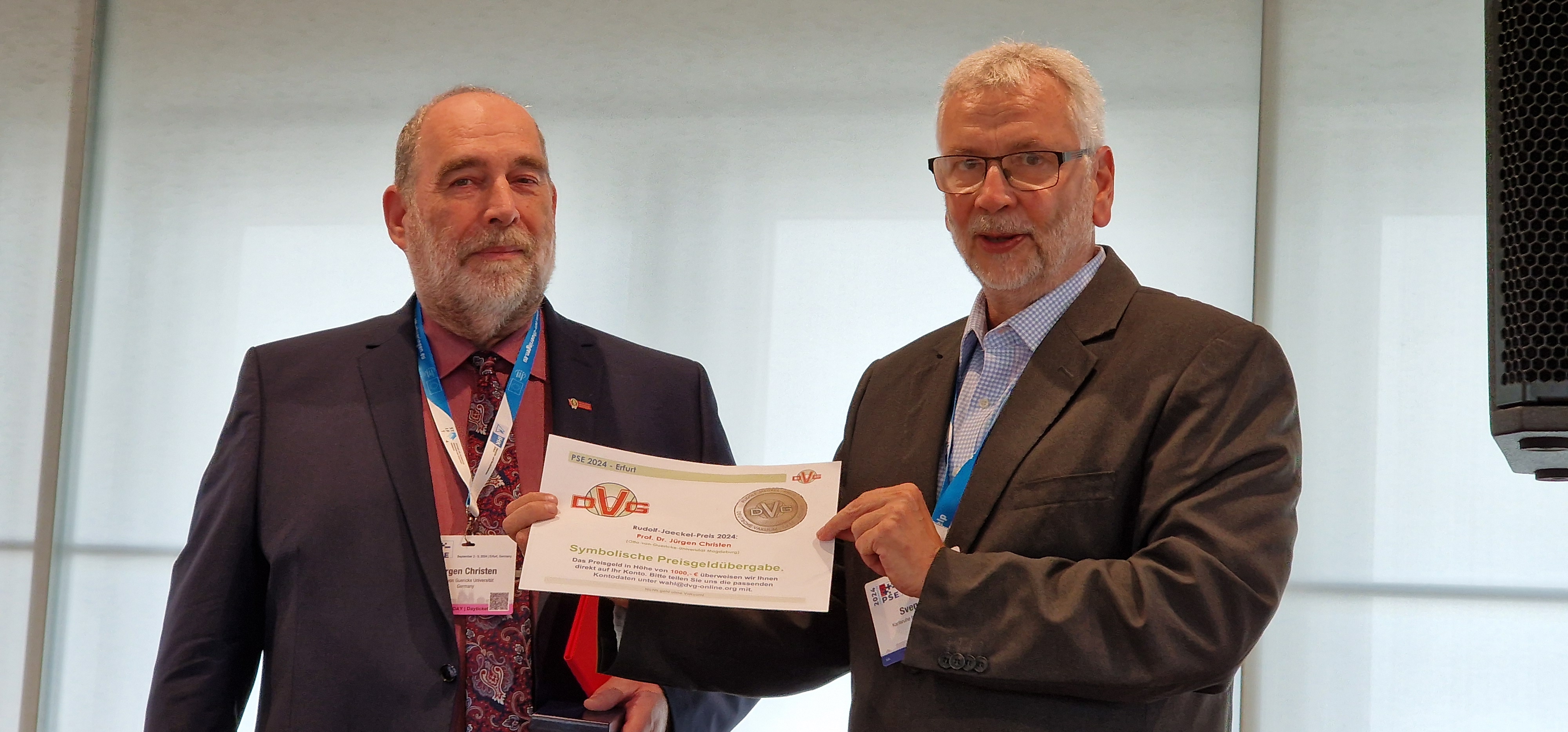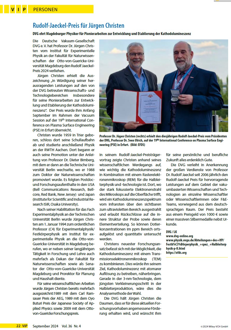Jürgen Christen erhielt die Auszeichnung „in Würdigung seiner herausragenden Leistungen auf den von der DVG betreuten Wissenschafts- und Technologiebereichen insbesondere für seine Pionierarbeiten zur Entwicklung und Etablierung der Kathodolumineszenz“. Der Preis wurde ihm Anfang September im Rahmen der Vacuum Session auf der 19th International Conference on Plasma Surface Engineering (PSE) in Erfurt überreicht.