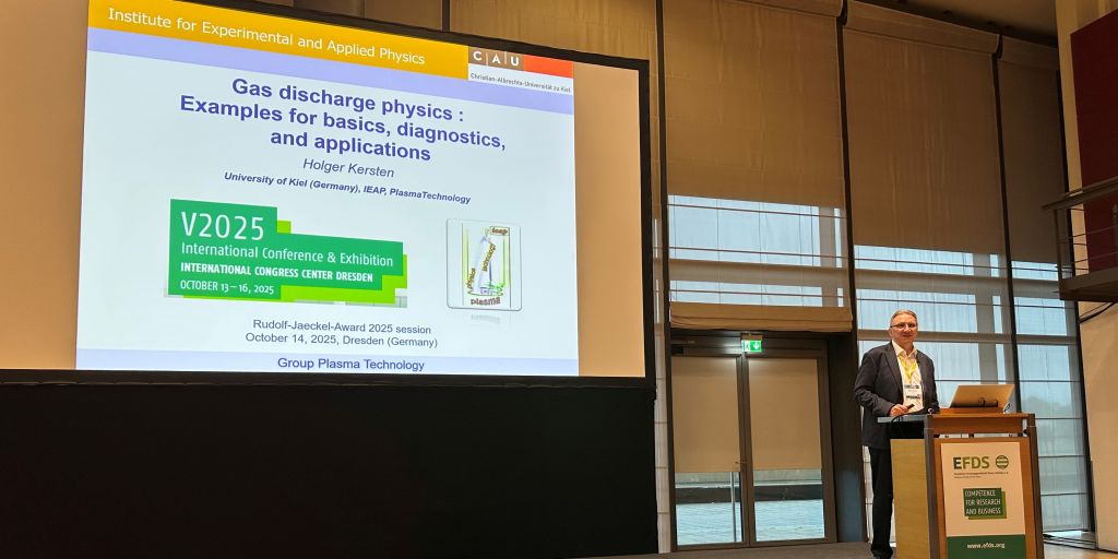 Dresden / Kiel / Kaiserslautern, 20. Oktober 2025 – Die Deutsche Vakuum-Gesellschaft (DVG) hat Prof. Dr. Holger Kersten vom Institut für Experimentelle und Angewandte Physik der Christian-Albrechts-Universität zu Kiel mit dem Rudolf-Jaeckel-Preis 2025 ausgezeichnet. Die feierliche Übergabe erfolgte im Rahmen der V2025 „International Conference and Exhibition for Vacuum – Plasma – Surface – Coating“ in Dresden.