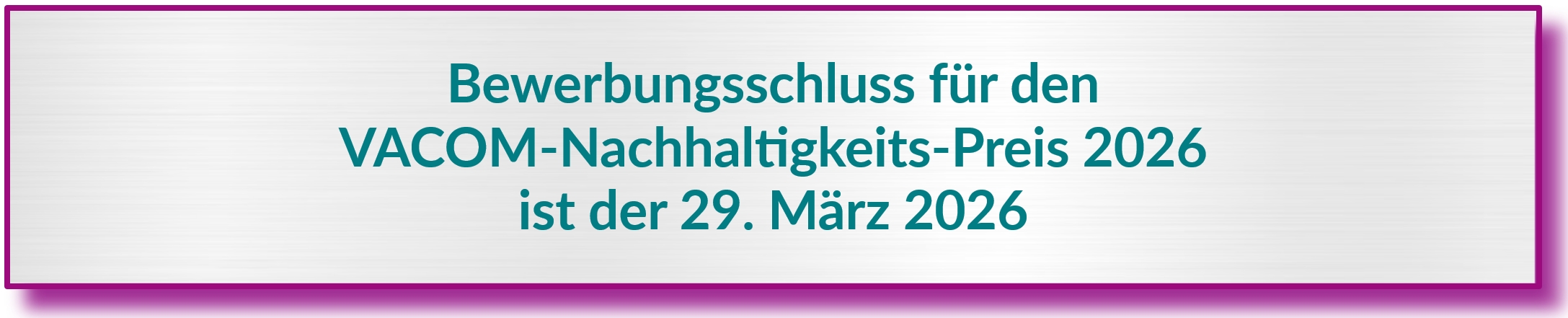 Der von VACOM gestiftete VACOM-Nachhaltigkeits-Preis ist mit 15.000 € dotiert und wir jährlich vergeben werden. Die Verwendung ist zweckgebunden für eine Forschungstätigkeit. Ein von der DVG gewähltes Preiskomitee bewertet die eingereichten Arbeiten und wählt die Preisträgerin oder den Preisträger aus. Zum Preiskomitee gehören neben einem Vorstandsmitglied der DVG und einem VACOM-Vertreter drei Hochschulprofessoren. Der Preisträger erhält neben einer Urkunde und der Dotierung auch die Möglichkeit eines Kennenlerntages bei VACOM.