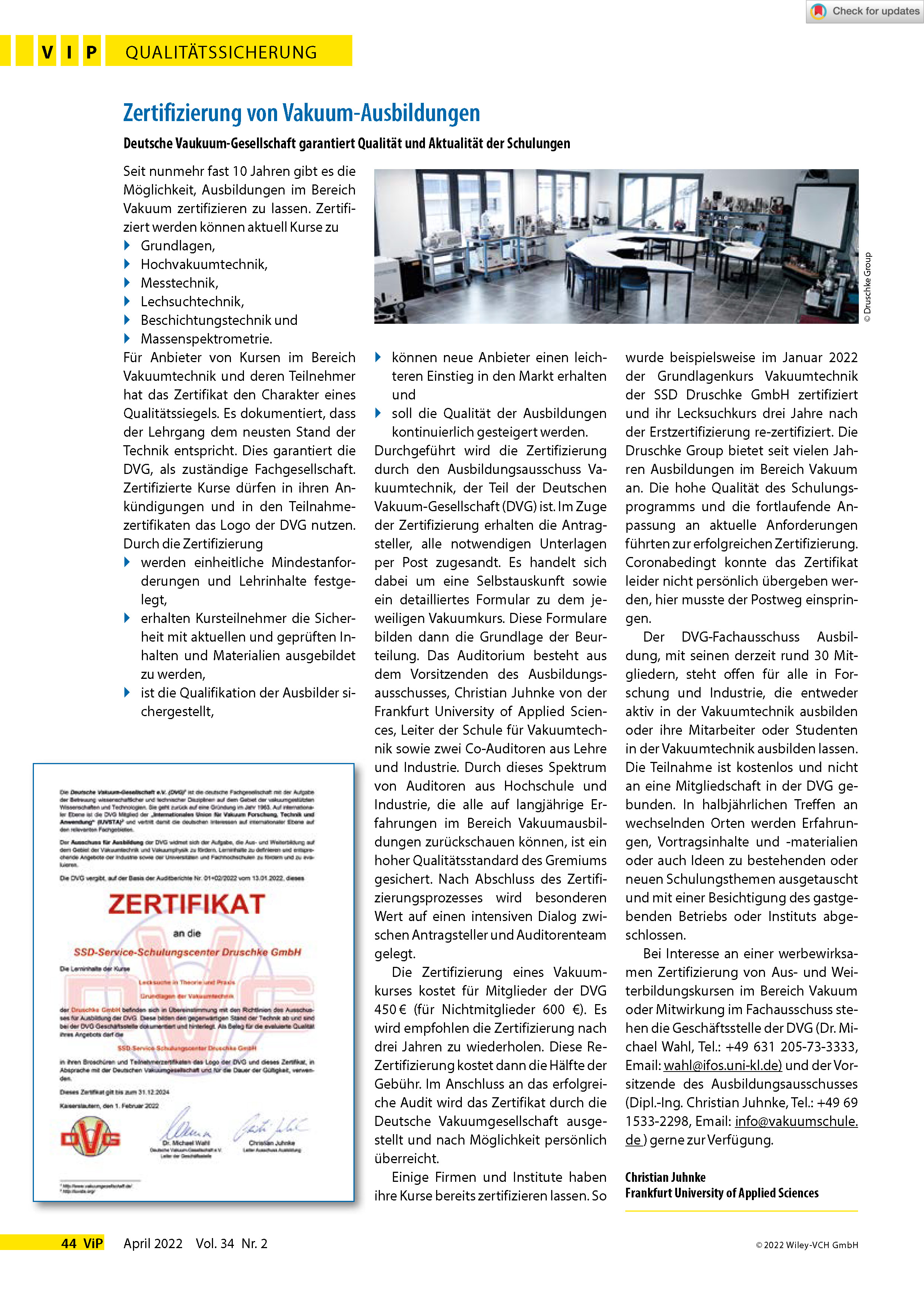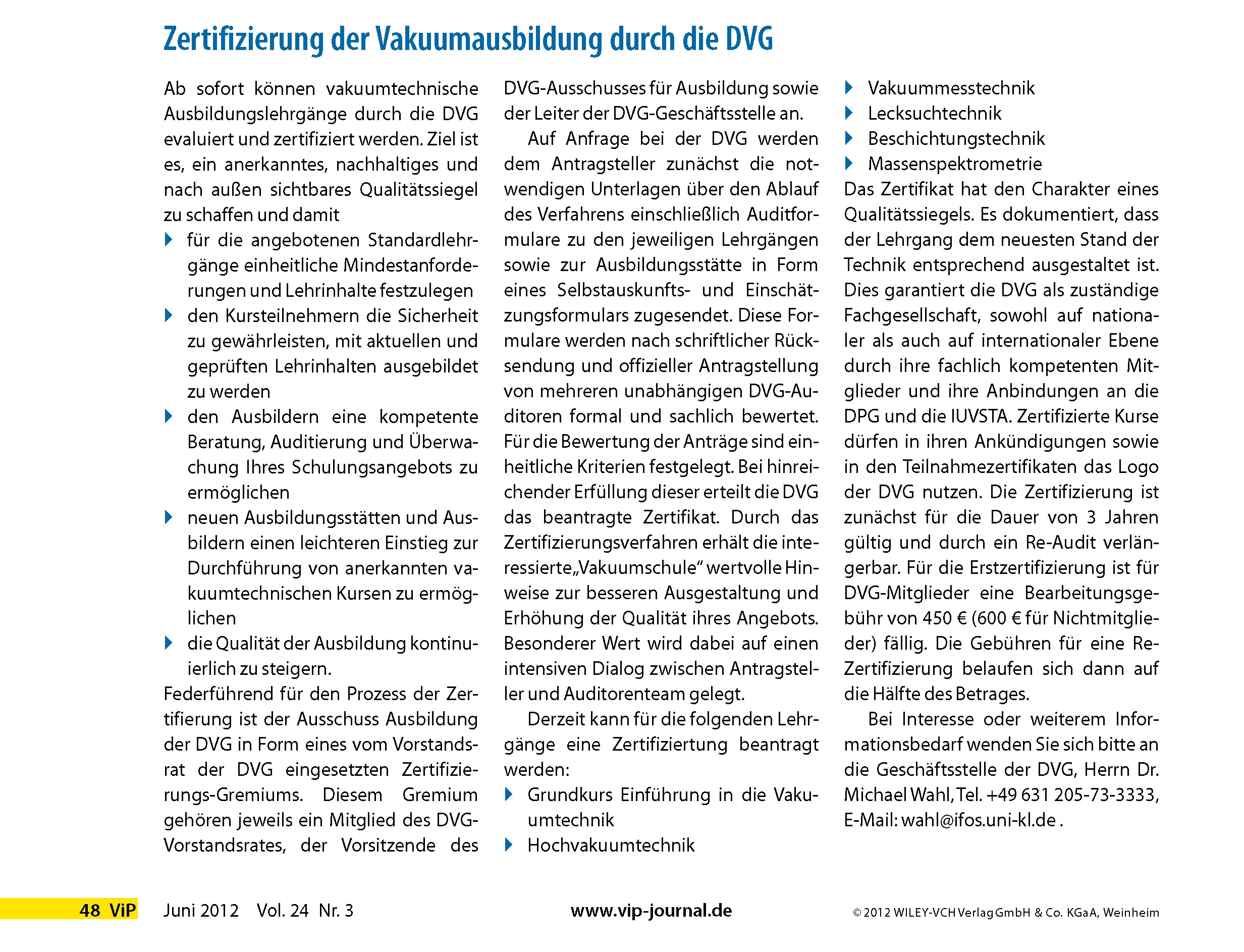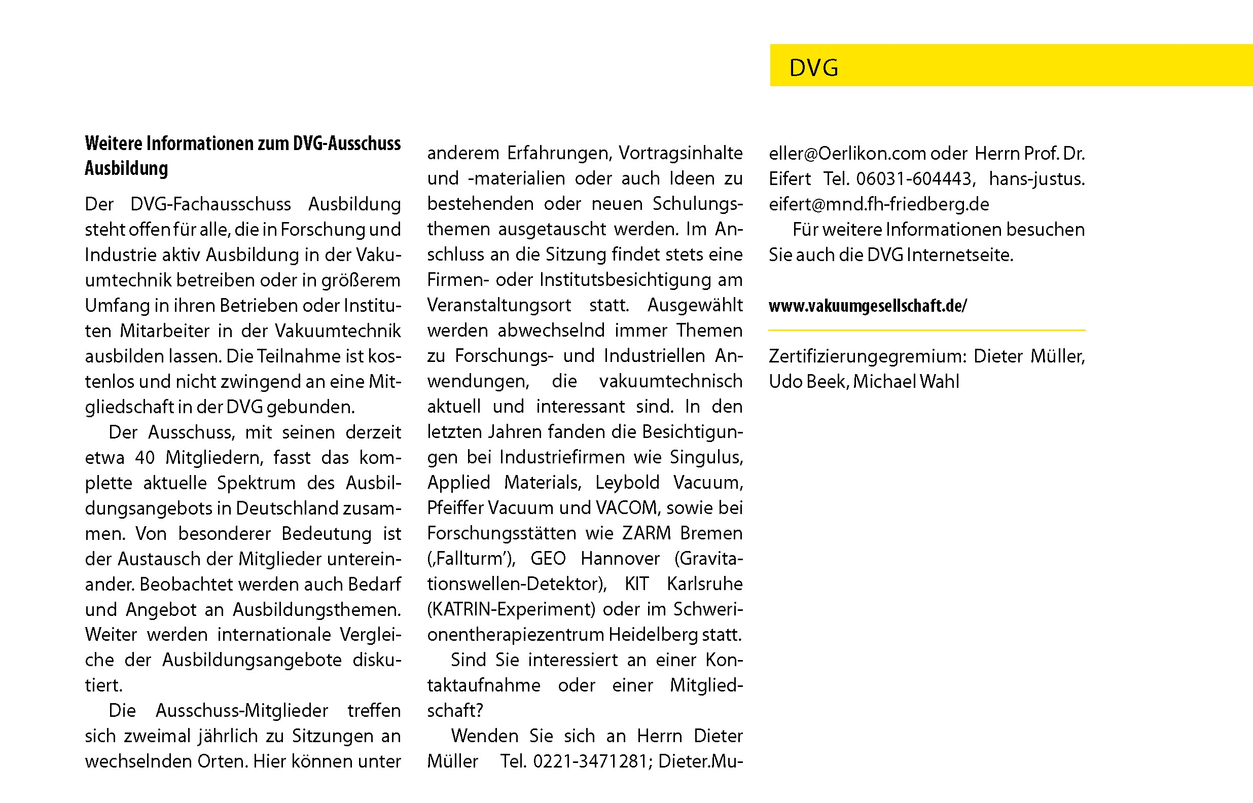 Die DVG prüft und zertifiziert auf Antrag vakuumtechnische Lehr- und Ausbildungsgänge („Vakuumschulen“) sowie auch Vakuum-Vorlesungen oder -kurse unterschiedlicher Anbieter (z.B. Firmen, Institute, Hochschulen etc.).