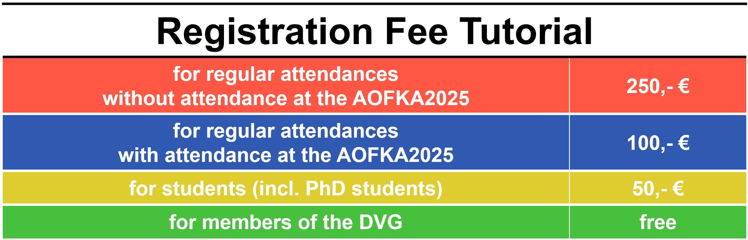 Für alle Studenten und Doktoranden kostet das Tutorium einen Unkostenbeitrag von 50,- €, für alle anderen Teilnehmer der AOFKA2025 kostet die Teilnahme 100,- €. Interessierte, die nicht an AOFKA2025 teilnehmen, zahlen eine Gebühr von 250 €. Für Mitglieder der DVG ist die Teilnahme kostenlos. Ein vorheriger Eintritt in die DVG mit einer zunächst auf das laufende Jahr befristeten Mitgliedschaft ist selbstverständlich möglich.