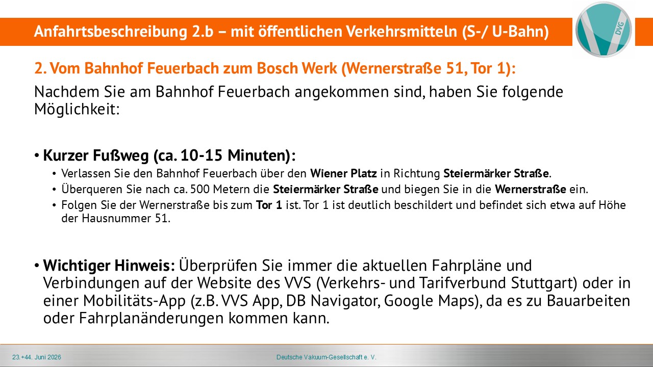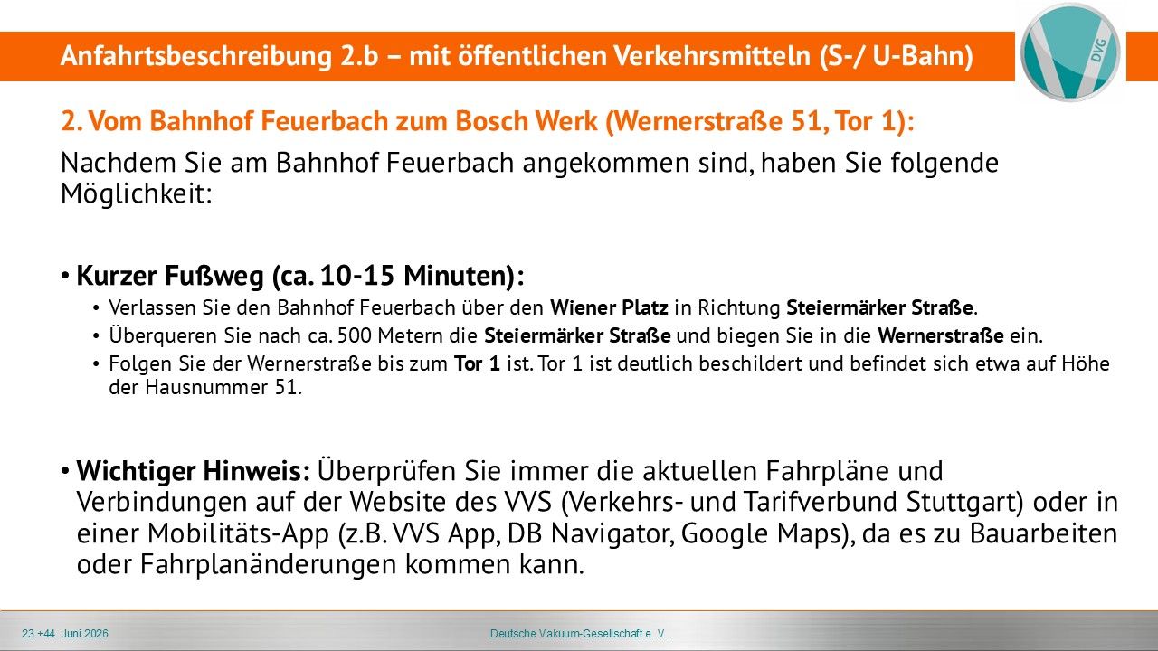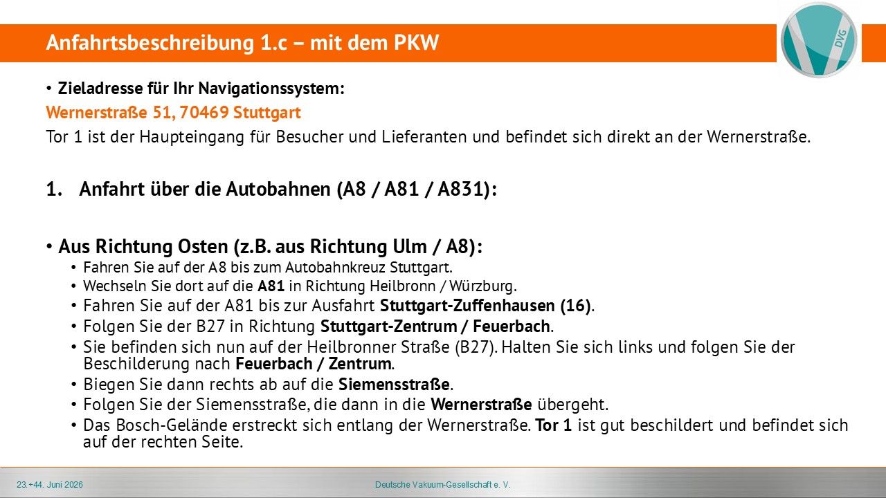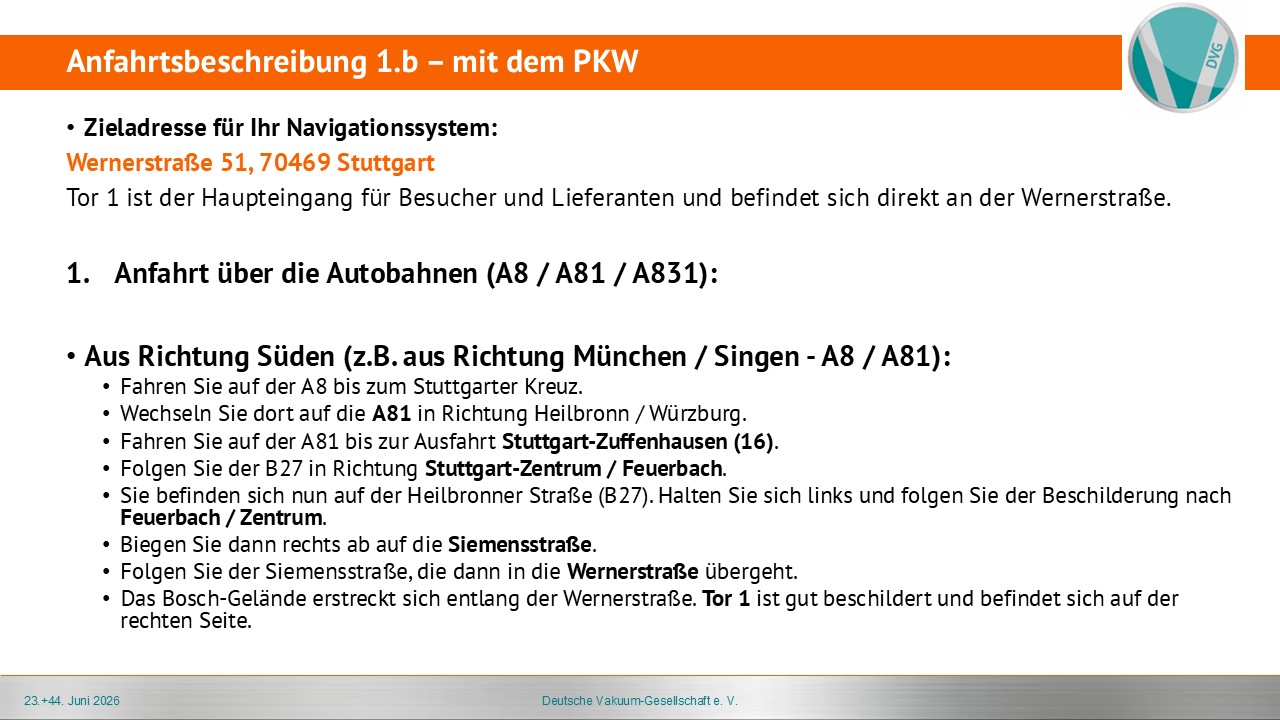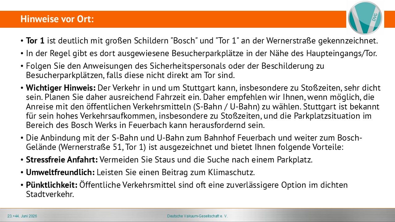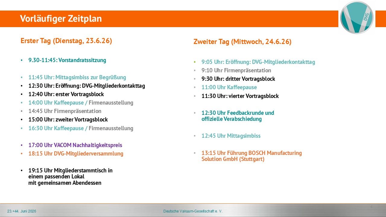 Im Anschluss an den Vortragsblock am Dienstag findet die Verleihung des VACOM Nachhaltigkeitspreises 2026 und die DVG-Mitgliederversammlung 2026 statt. Den Abschluss am Abend bildet der beliebte DVG-Mitgliederstammtisch, bei dem in lockerer Runde über viele fachliche und auch persönliche Thema gesprochen werden kann. Integriert in das komplette Veranstaltungsprogramm ist auch eine kleine Firmenausstellung sowie verbale Firmenpräsentationen der interessierten DVG-Firmenmitglieder.
