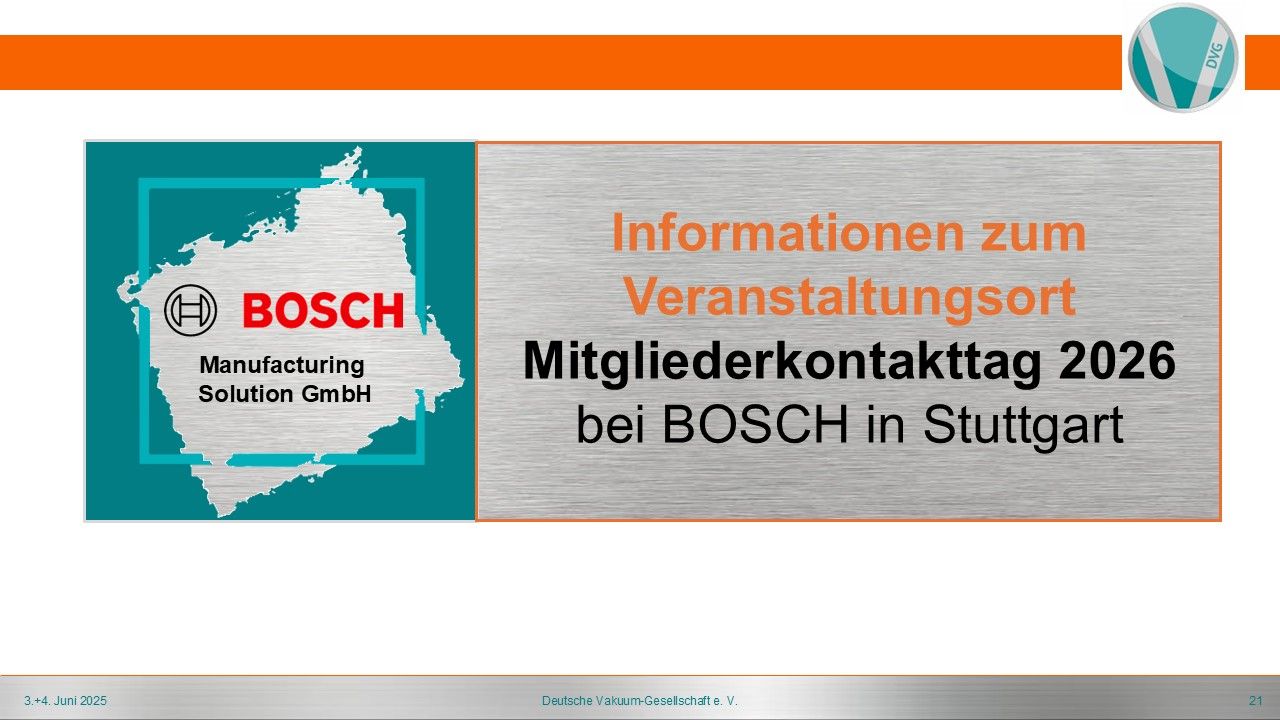 Auch im Jahr 2026 lädt die Deutsche Vakuum-Gesellschaft ihre Mitglieder sowie alle an vakuumgestützten Technologien interessierten Fachleute herzlich zum nächsten DVG-Mitglieder-Kontakttag ein.