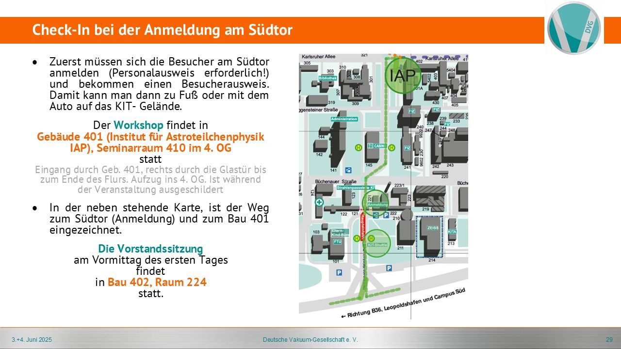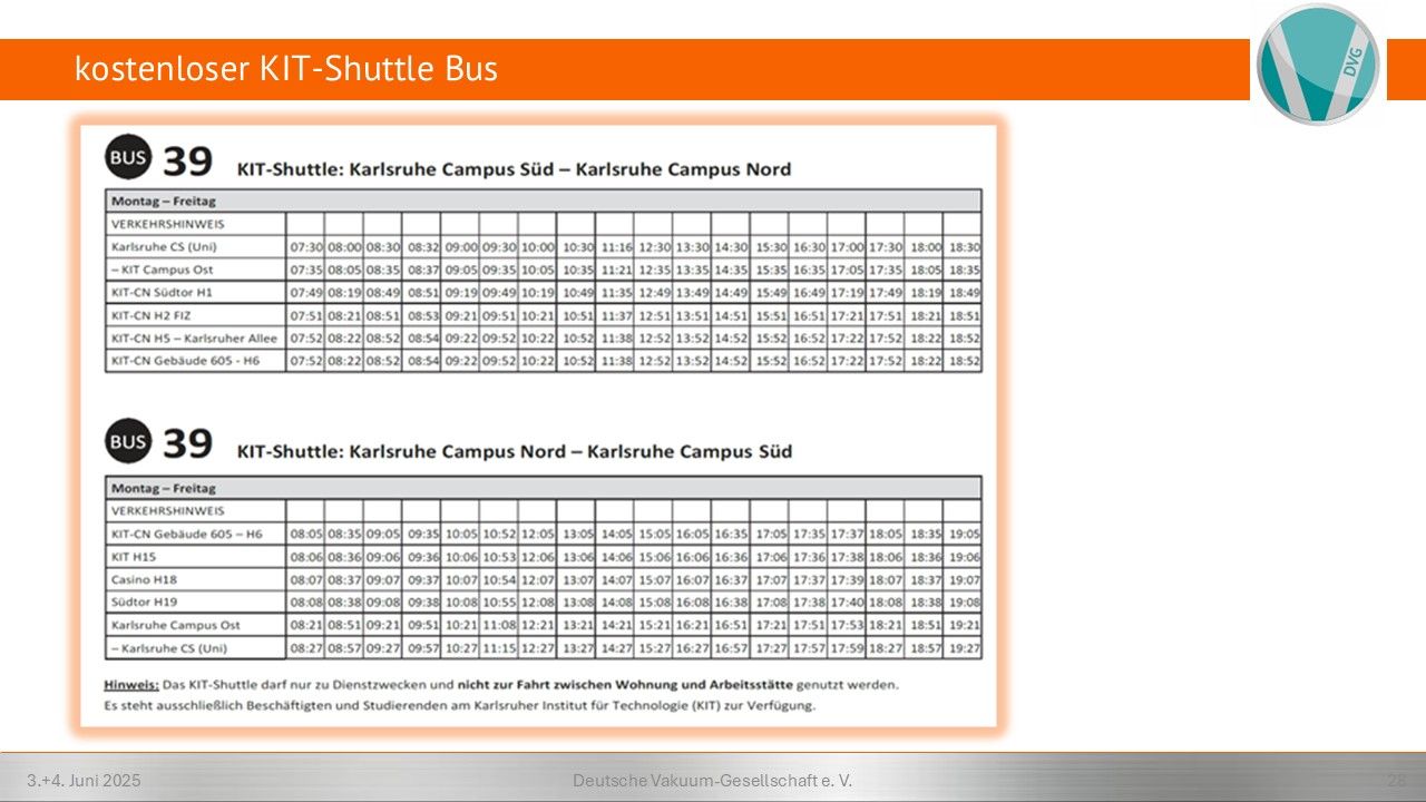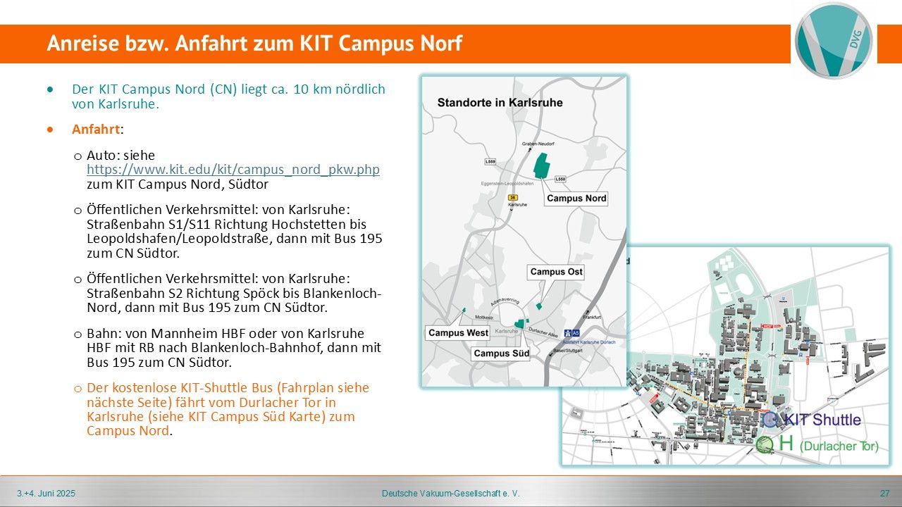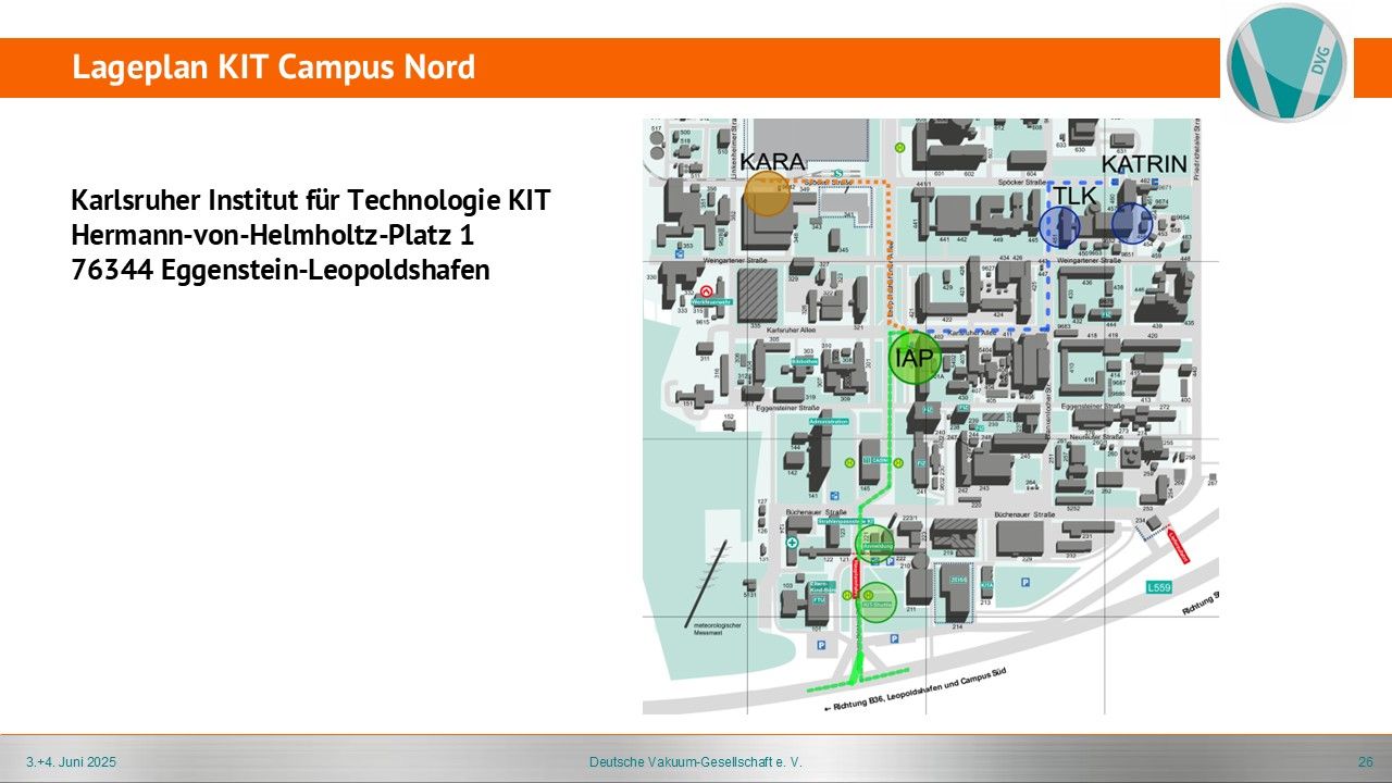 Der DVG-Mitglieder-Kontakttag 2025 findet am KIT Campus Nord (CN) statt. Dieser Campus liegt ca. 10 km nördlich von Karlsruhe und ist auch sehr gut mit den öffentlichen Verkehrsmitteln zu erreichen.