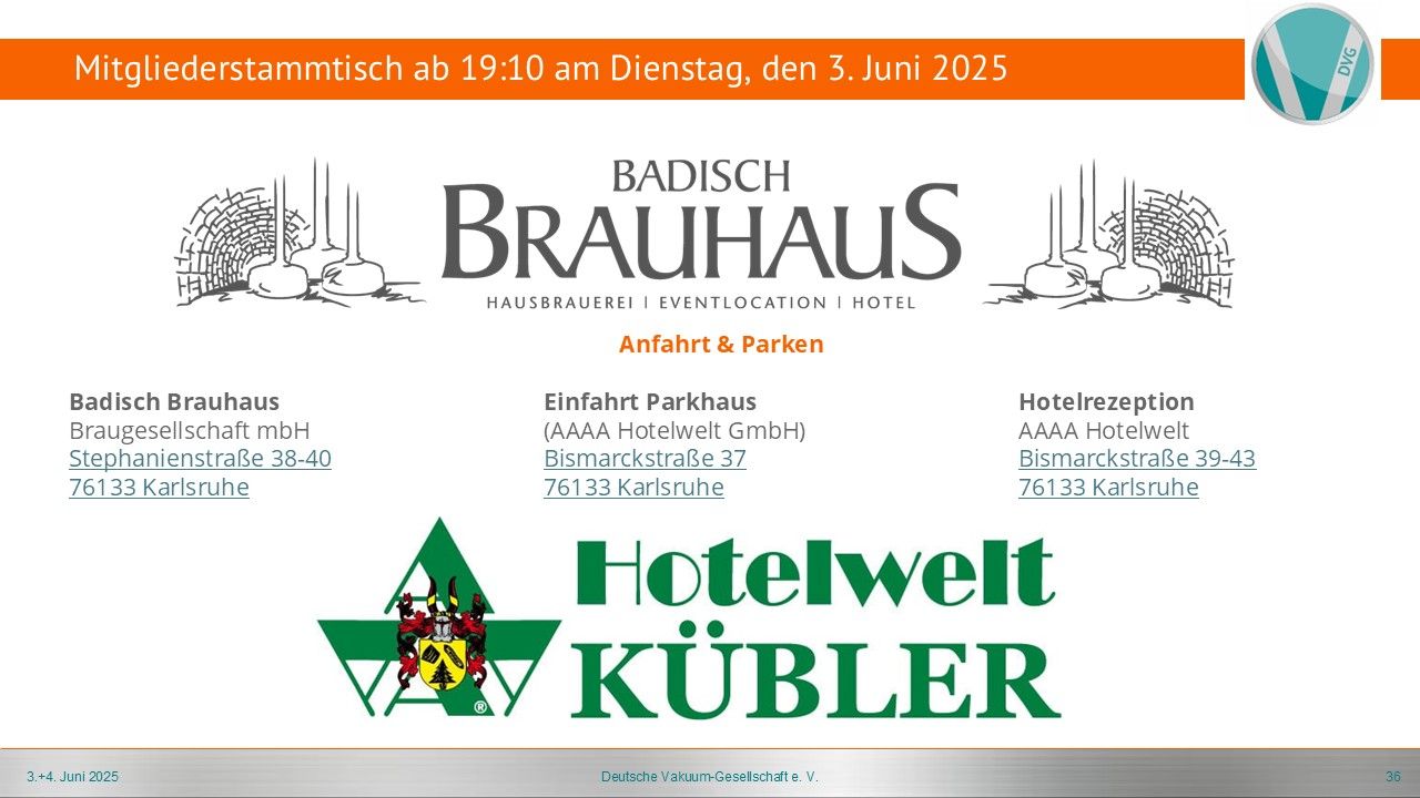 Der Mitgliederstammtisch am Dienstag Abend im Anschluss an die DVG Mitgliederversammlung findet im