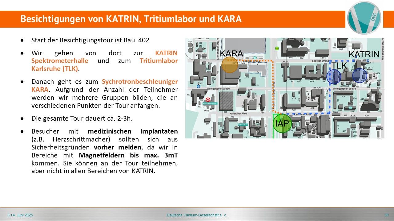 Nach dem Vortragsblock und der abschließenden Feedbackrunde am zweiten Veranstaltungstag endet der diesjährige Mitglieder-Kontakttag sicherlich noch mit einem besonderen Höhepunkt der Besichtigungen der Spektrometerhalle von KATRIN, des Tritiumlabors Karlsruhe (TLK) sowie des Sychrotronbeschleunigers KARA. Je nach Anzahl der Teilnehmer wird dies in mehrere Gruppen erfolgen. Für die gesamte Tour ist eine Dauert ca. 2-3h vorgesehen.