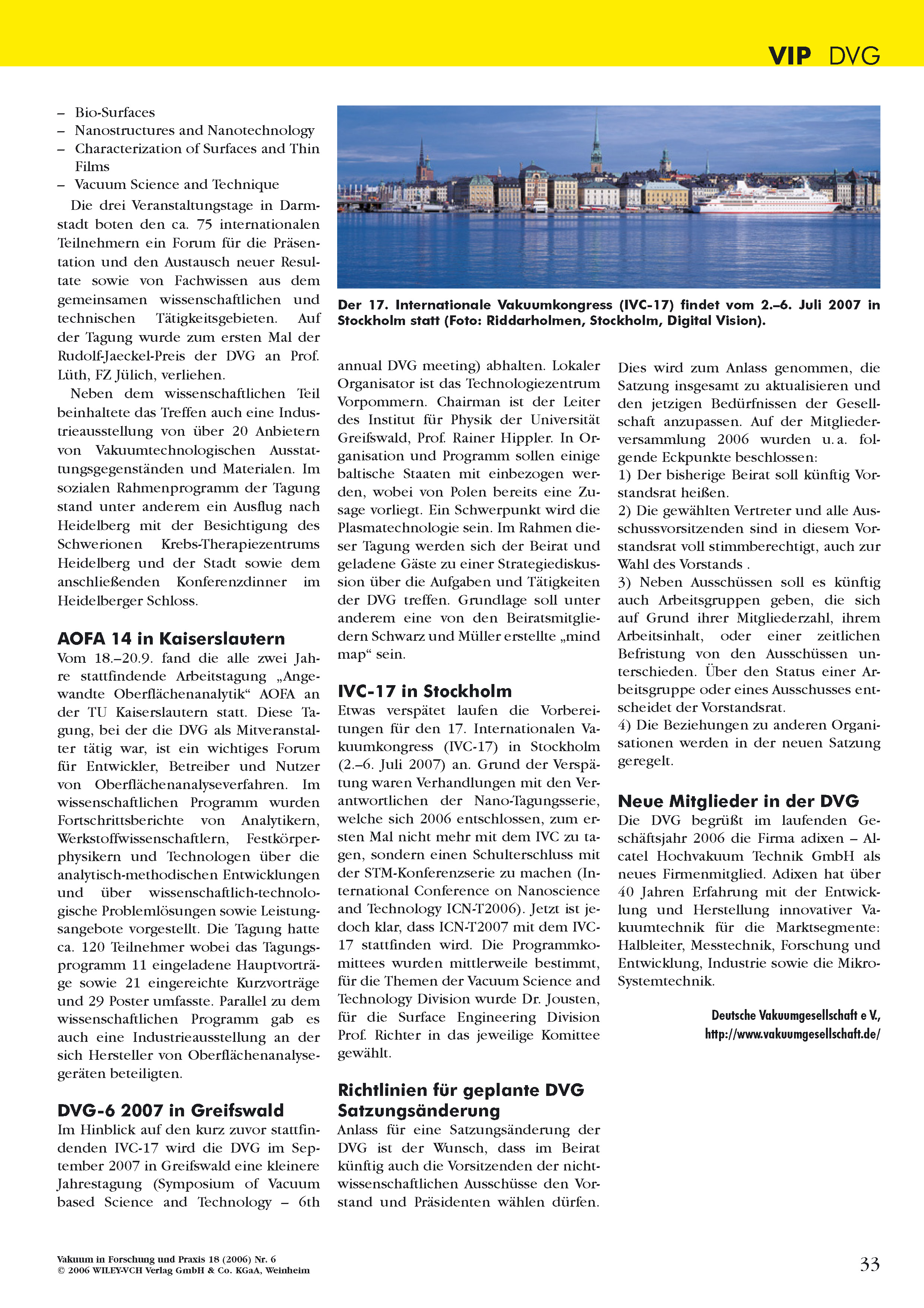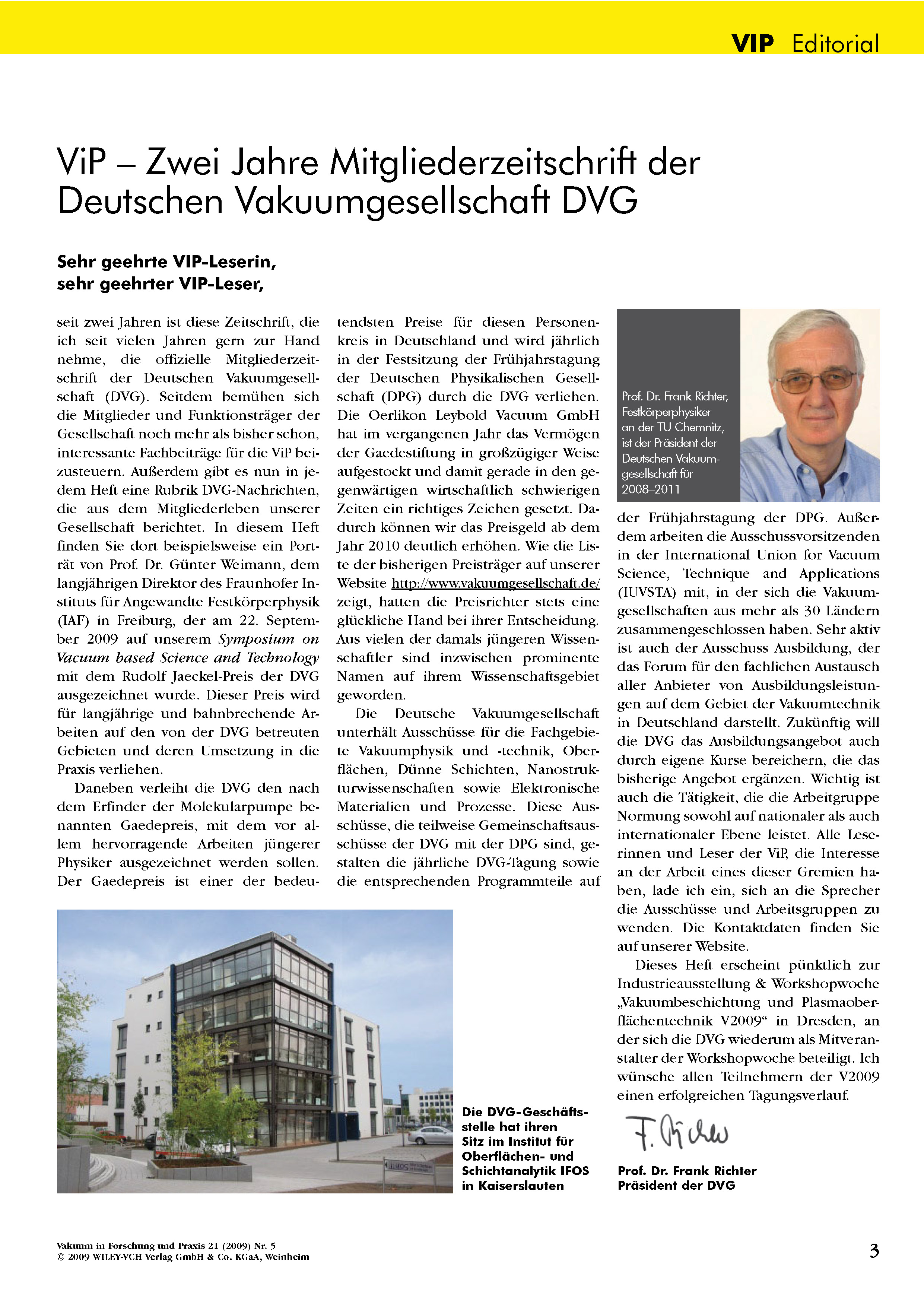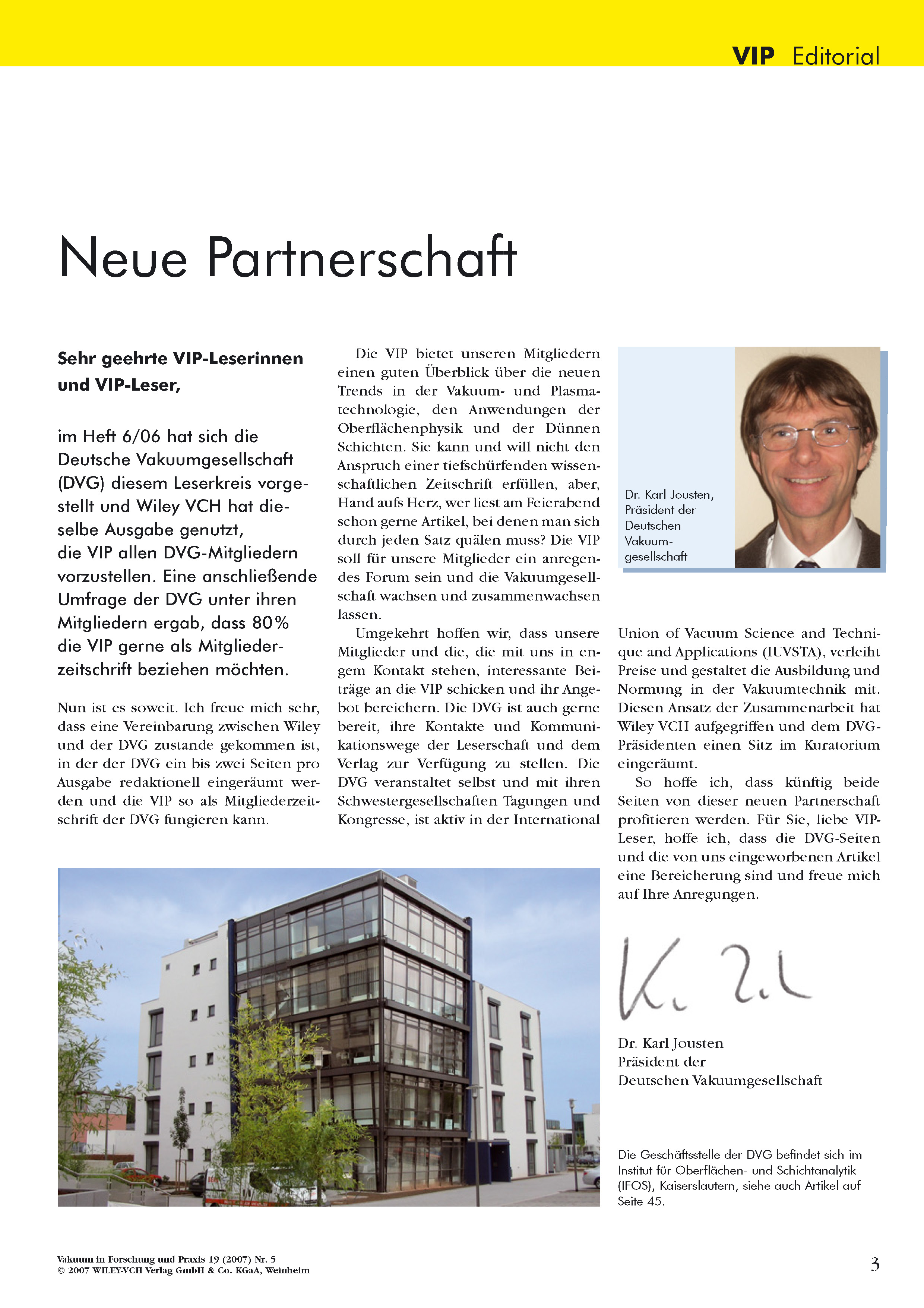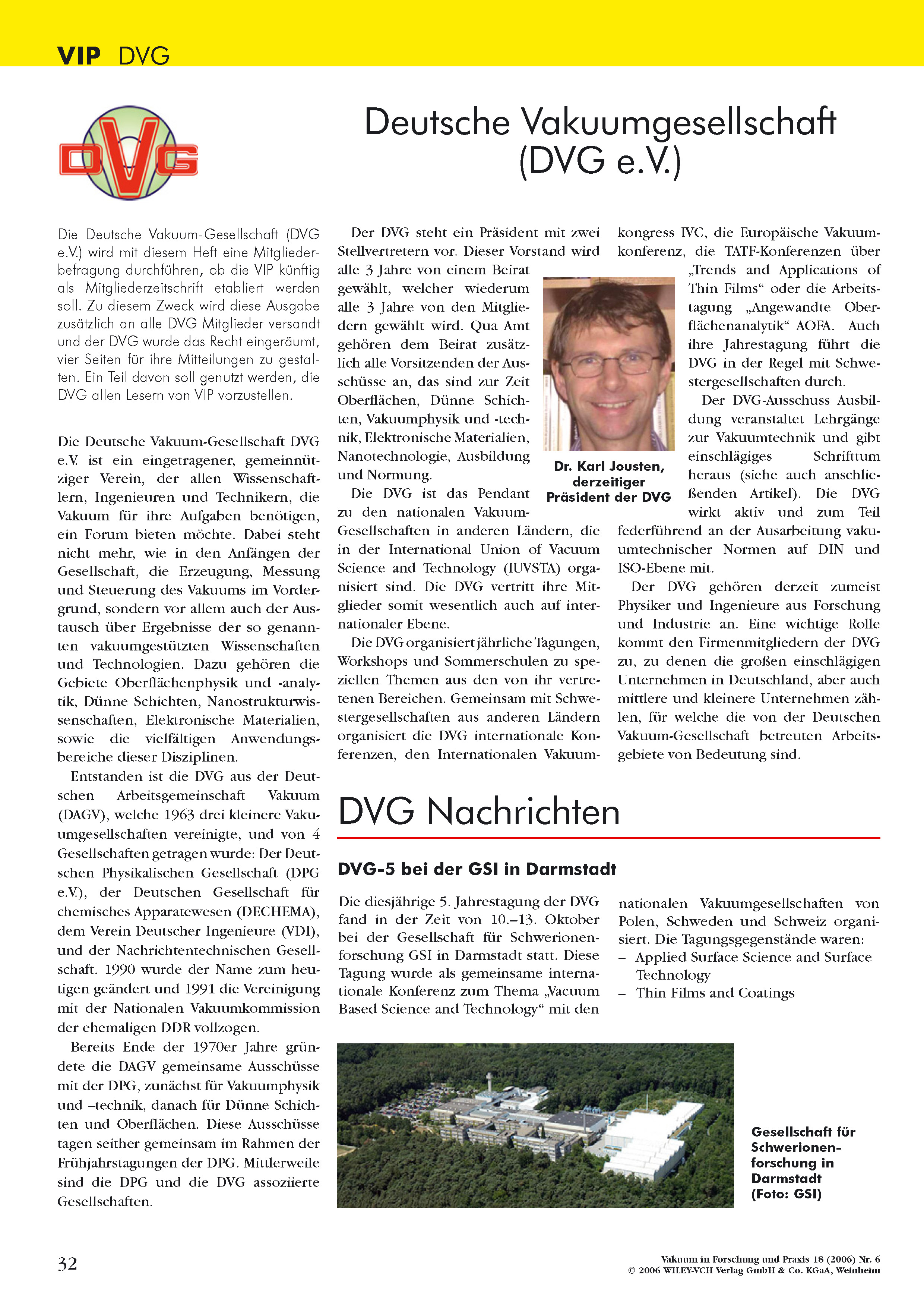 Im Editorial der Ausgabe 05-2007 präsentierte der damalige Präsident Dr. Karl Jousten den Mitgliedern mit Freude die "Vakuum in Forschung und Praxis" VIP als die neue Mitgliederzeitschrift der DVG.