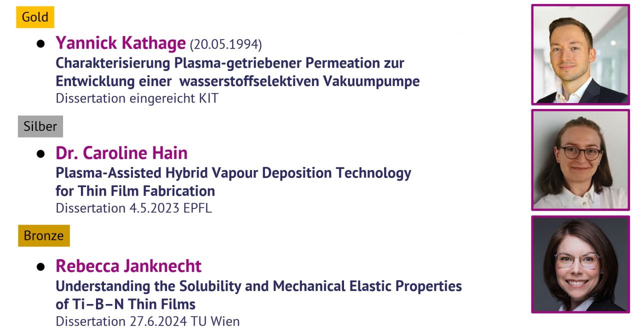 Yannick Kathage erarbeitete ein Konzept zur Rückgewinnung von Tritium in thermonuklearen Fusionsreaktoren, Caroline Hain gelang durch Verwendung von Mikrowellenplasmen eine verbesserte Phänomenkontrolle gesputterter Schichten, und Rebecca Janknecht fand heraus, wie sich Bor in Titannitridschichten einbindet.