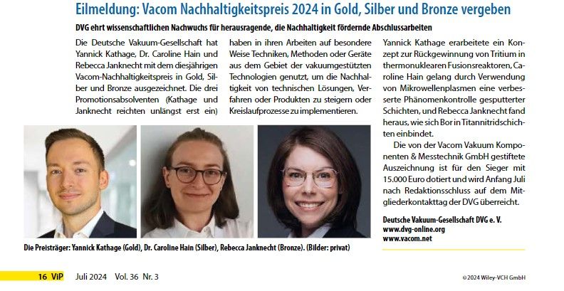 Die Deutsche Vakuum-Gesellschaft hat Yannick Kathage, Dr. Caroline Hain und Rebecca Janknecht mit dem diesjährigen Vacom-Nachhaltigkeitspreis in Gold, Silber und Bronze ausgezeichnet. Die drei Promotionsabsolventen haben in ihren Arbeiten auf besondere Weise Techniken, Methoden oder Geräte aus dem Gebiet der vakuumgestützten Technologien genutzt, um die Nachhaltigkeit von technischen Lösungen, Verfahren oder Produkten zu steigern und Kreislaufprozesse zu implementieren.