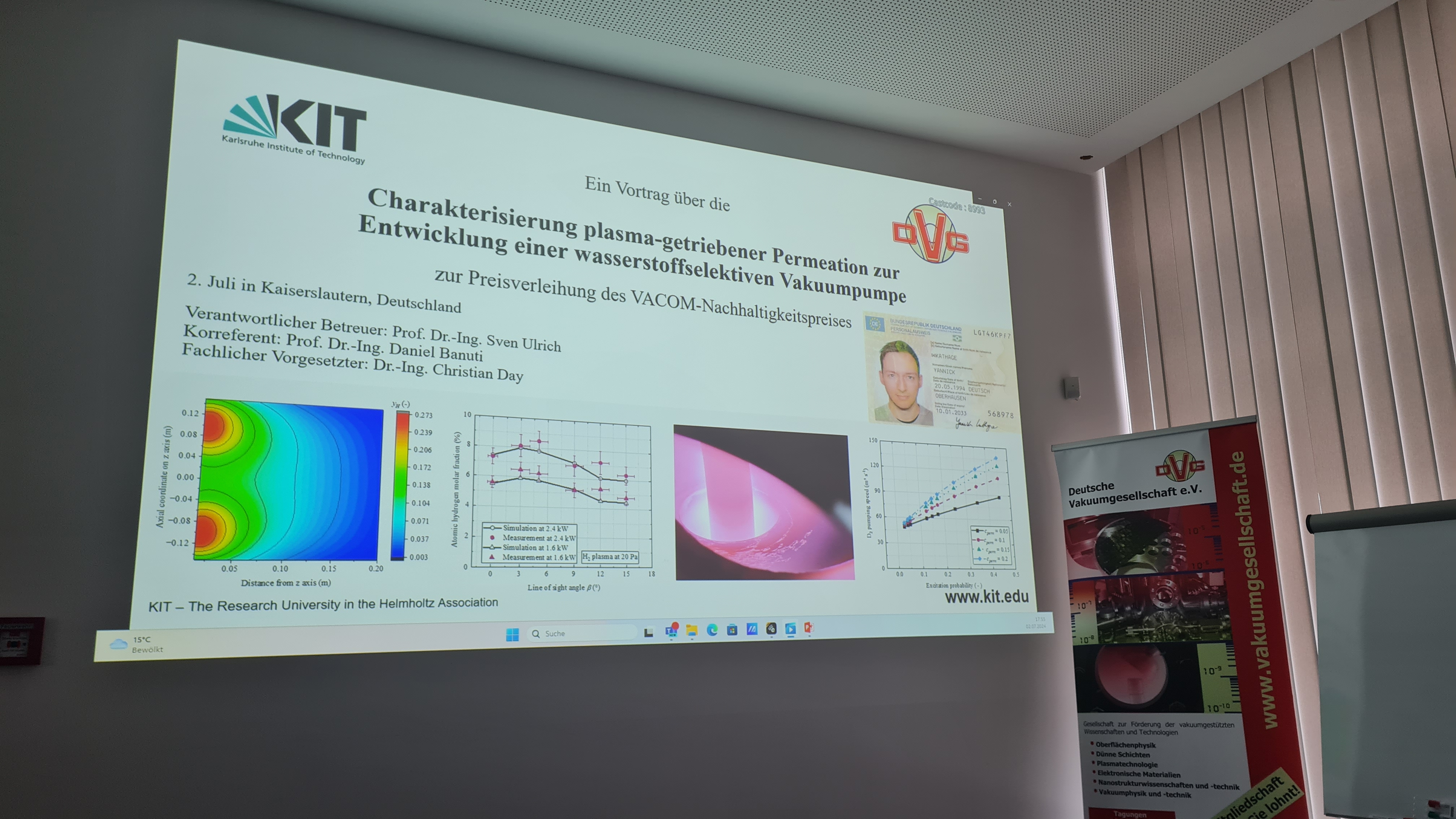Dr. Patrik Hofmann von der Bosch GmbH als zweiter Sieger und damit Preisträger in Silber beendete seine Dissertation „Simulative Optimierung von plasmagestützten Vakuumbeschichtungsprozessen im Februar 2023 am KIT. In seinem Vortrag konnte auch er seine wichtigsten Ergebnisse den Teilnehmern des Kontakttages vorstellen.