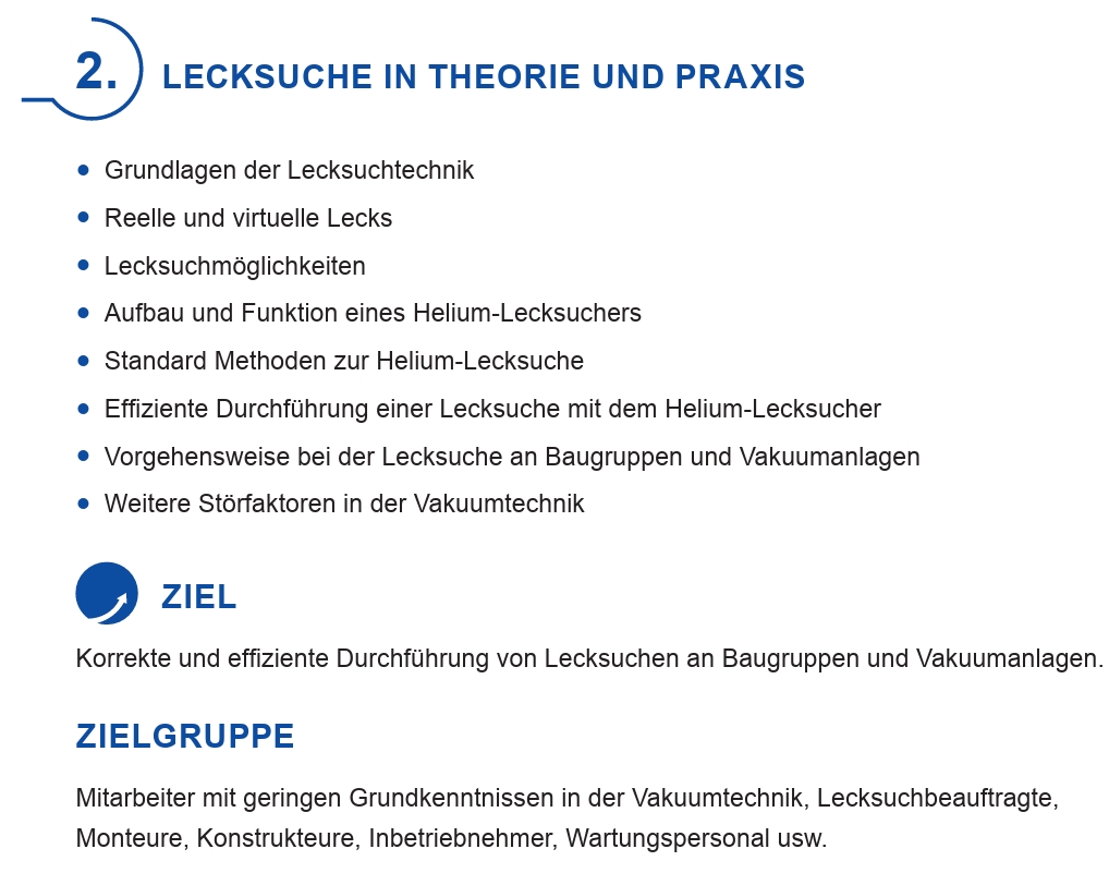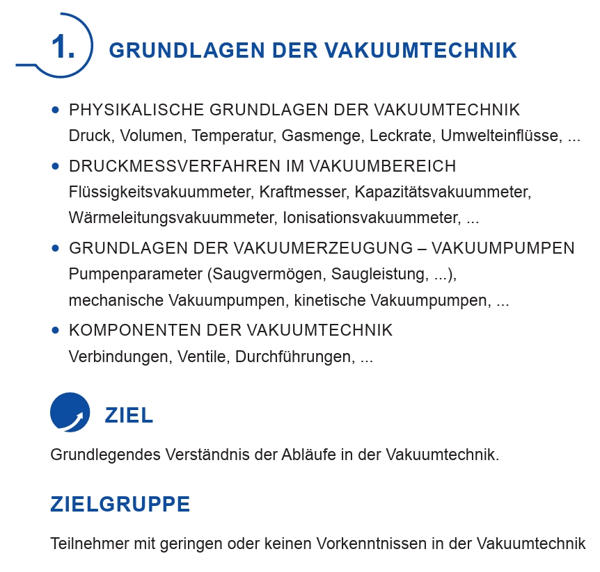 Der Lehrgang bietet grundlegendes Verständnis der Abläufe in der Vakuumtechnik Auf eine praktische Demonstration des vermittelten Wissens wird großer Wert gelegt. Die Teilnehmer sollen typische Auswirkungen der einzelnen Effekte anhand von Experimenten begreifen, um diese nachhaltig in Erinnerung zu behalten. Der genaue Inhalt des Seminars wird speziell auf die Bedürfnisse der Teilnehmer angepasst.