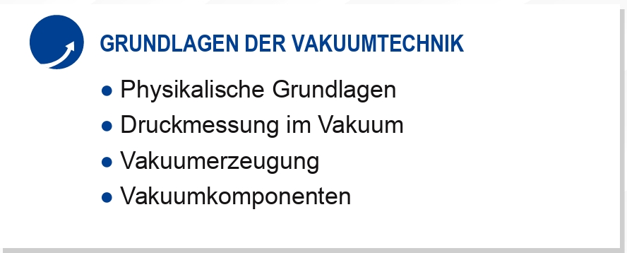 Das Seminar behandelt die Grundlagen der Vakuumphysik und der Vakuumtechnik, die zum Verständnis vakuumtechnischer Vorgänge, zur richtigen Auswahl und zum effektiven Einsatz vakuumtechnischer Anlagen bzw. moderner Vakuumtechnologien oder zum Eigenbau von Vakuumkomponenten erforderlich sind. Auch als Inhouse-Schulung ideal geeignet.