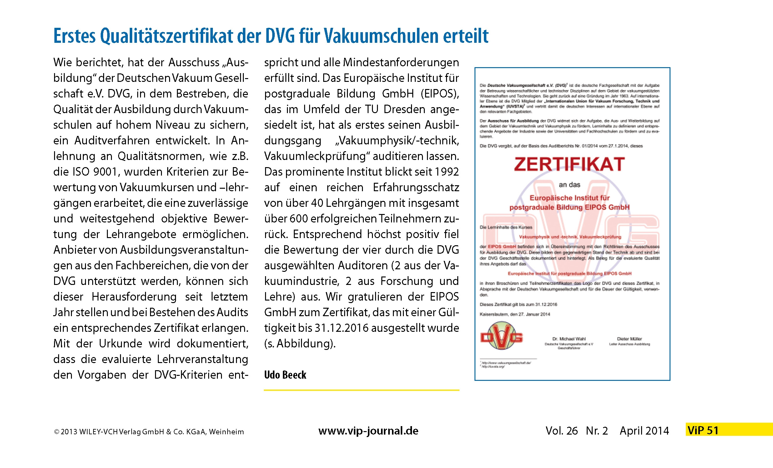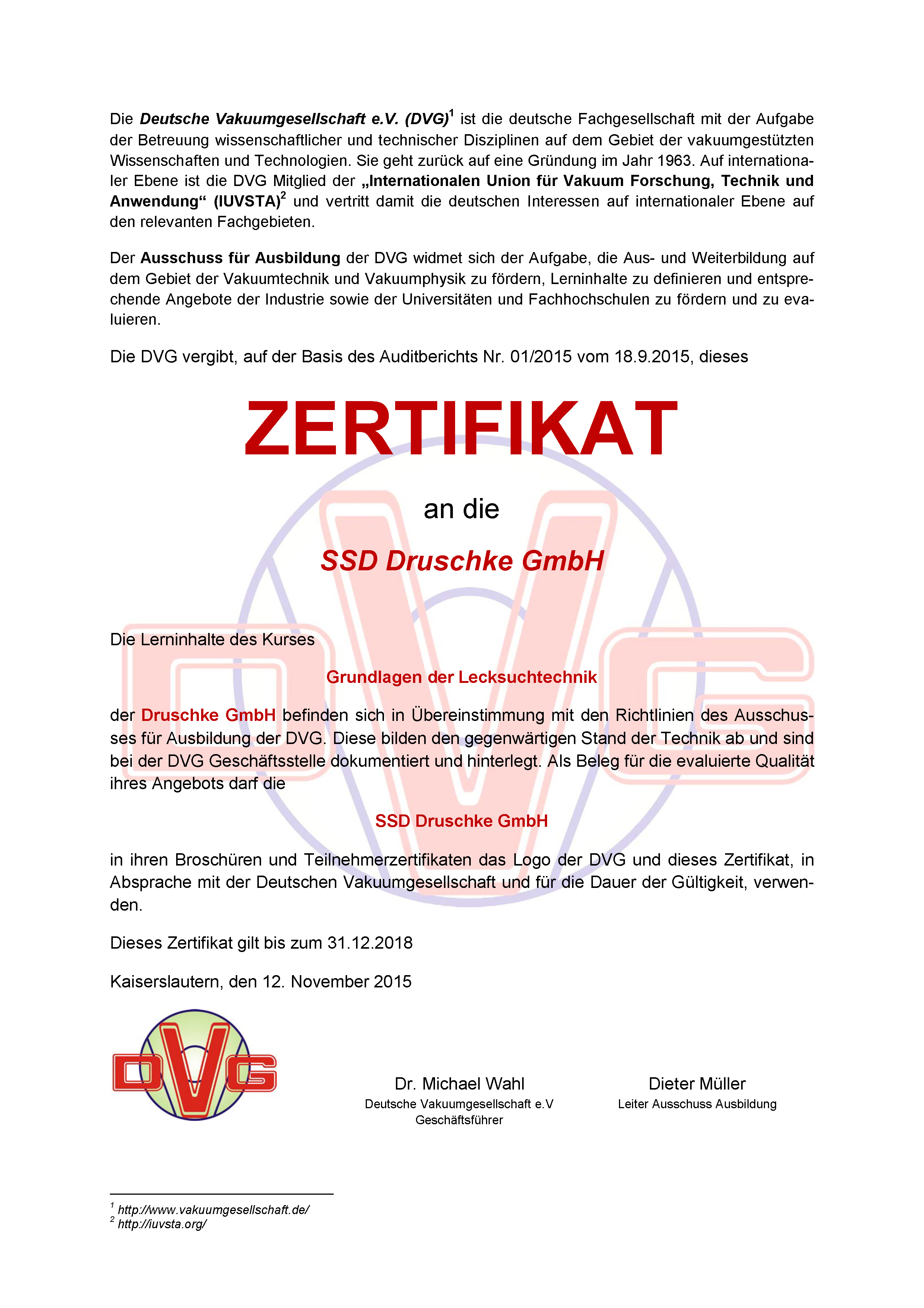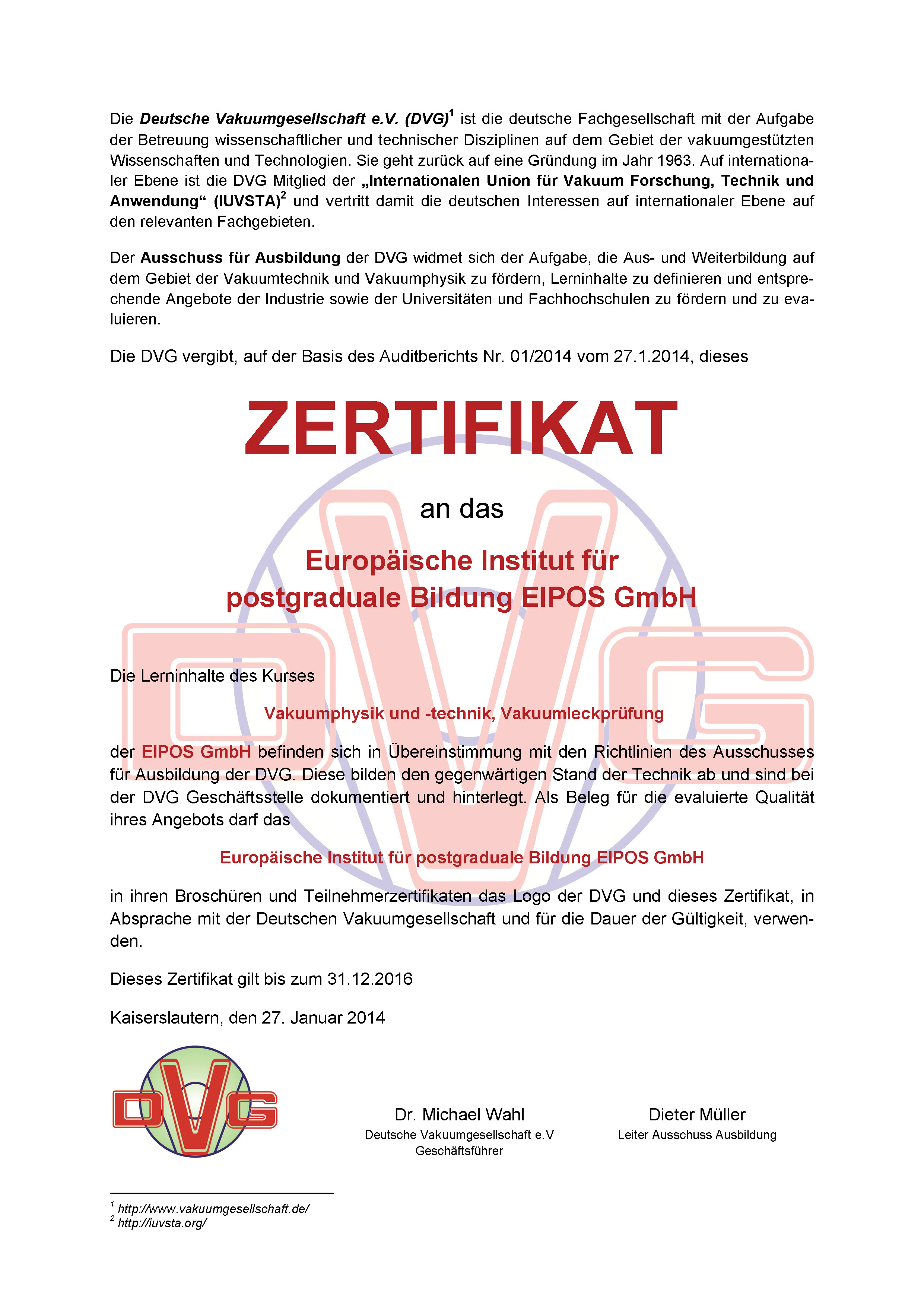 Der Lehrgang ist als erster und damals einziger in Deutschland von der Deutsche Vakuumgesellschaft e.V. (DVG) zertifiziert. Das Zertifikat bestätigt die fachliche Aktualität des Lehrganges und damit die Übereinstimmung mit dem gegenwärtigen Stand der Technik sowie den Richtlinien der DVG.