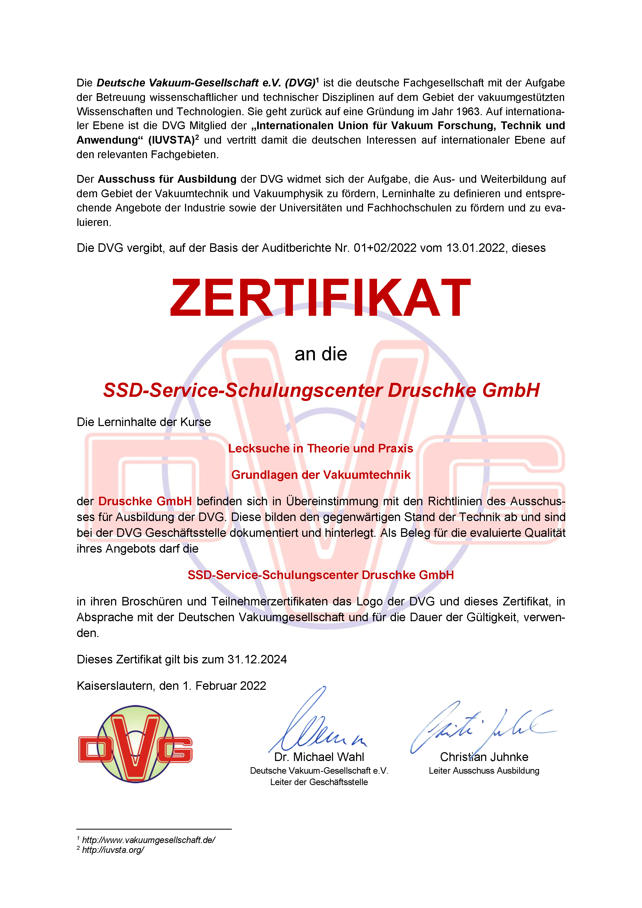 Nach der ersten Zertifizierungen der DRUSCHKE Vakuum-Schulung erfolgte 2022 eine Rezertifizierung des Grundlagenkurses und eine Neuzertifizierung der Kurses Vakuum-Lecksuche.